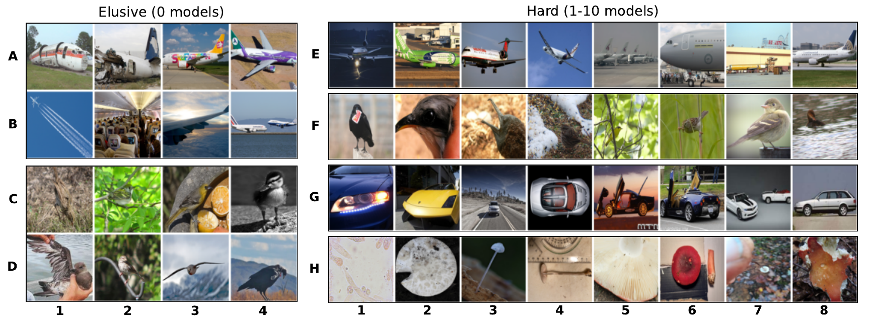 Finally, we show some examples of difficult images. We notice some patterns in these images such as camoflauge, occlusion, non-standard poses, or multiple objects. We hypothesize that these factors contribute to the image difficulty; but we must be careful not to confuse correlation with causation. Determining the real or exact reasons for misclassification is a challenging task.