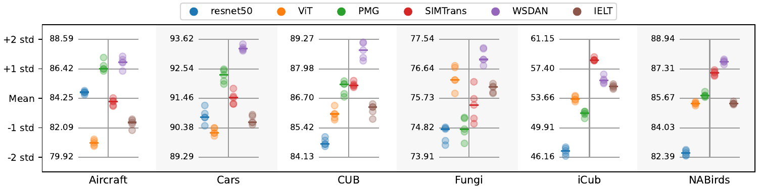 For our analysis, we train five models (using different random seeds) for each of the model types. Accuracy of these models is shown below. We find that the models tend to underperform the results reported in their respective papers when they are reimplemented in a standardized context. We found that WS-DAN performed particularly well, despite being an older approach.
